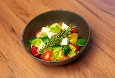 270/30 г • салат, огурец, перец сладкий, томаты Чери, сыр рассольный, оливки, маслины, заправка для Греческого/salad, cucumber, sweet pepper, Cherry tomatoes, pickled cheese, olives, olives, dressing for Greek